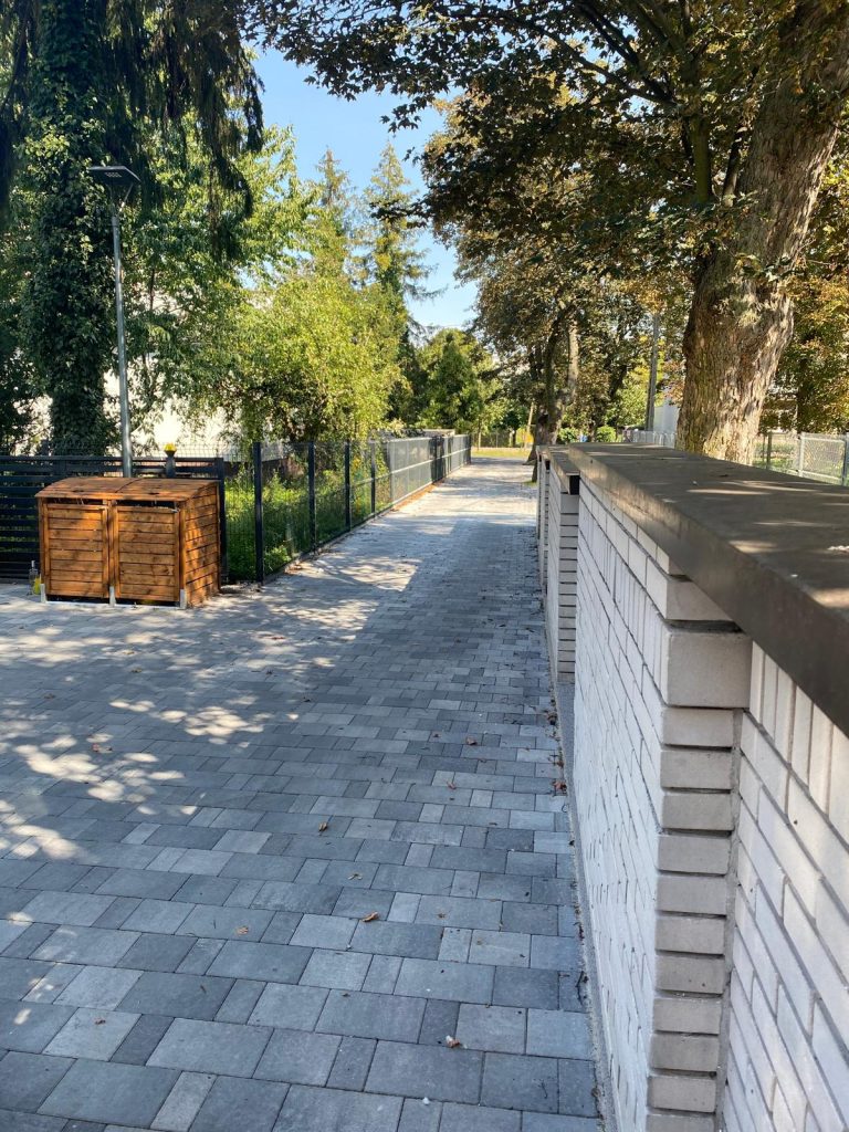 Nowy podjazd, ogrodzenie i uporządkowane otoczenie tworzą spójną całość, która doskonale komponuje się z zielenią wokół. Renowacja ta jest dowodem na to, że każdy budynek może stać się wizytówką nowoczesnego podejścia do architektury i komfortu.